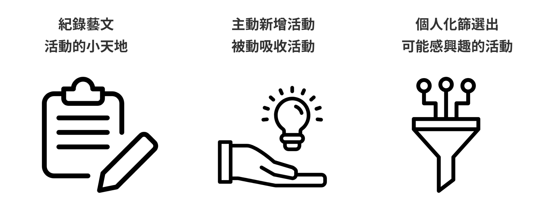 使用者一註冊後就跳出幾題的個人化問題,例如:「有興趣的藝文活動類型?」、「可接受的票價範圍?」讓使用者一進到平台就可以根據他的偏好先篩選出使用者可能感興趣的活動,不用在平台上大海撈針找自己想參加的活動。