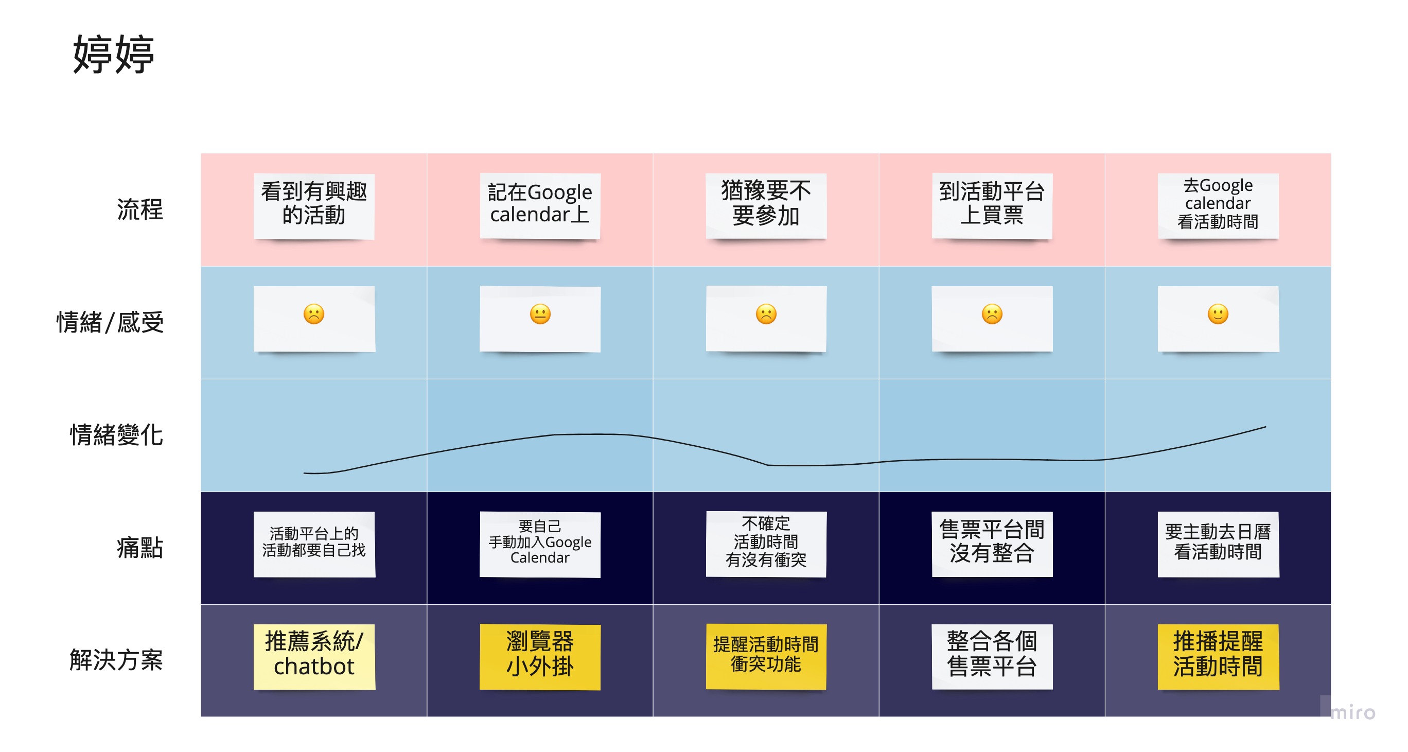 我們共訪談了5位使用者,彙整成3份 Persona 並整理成顧客旅程地圖如下:
