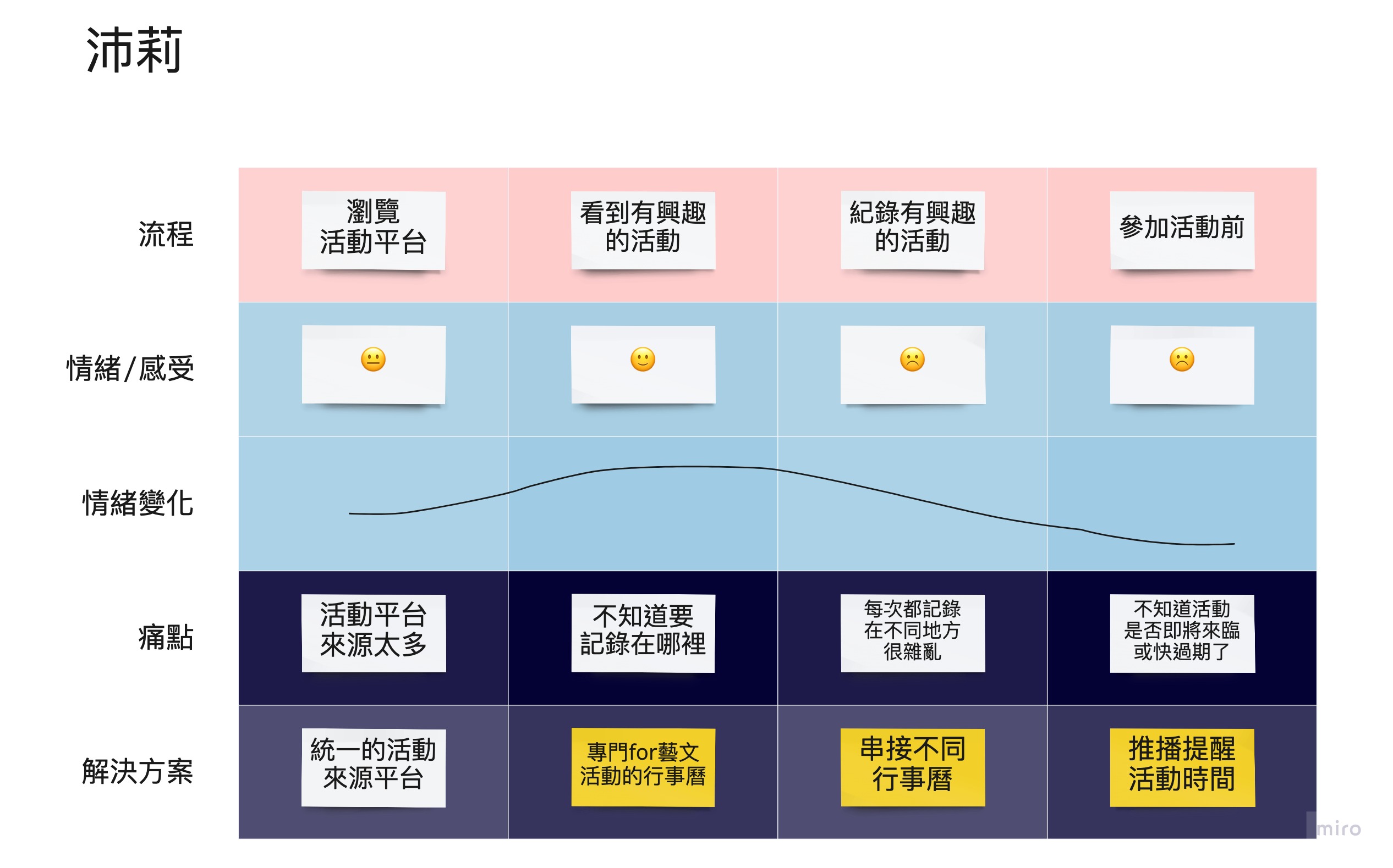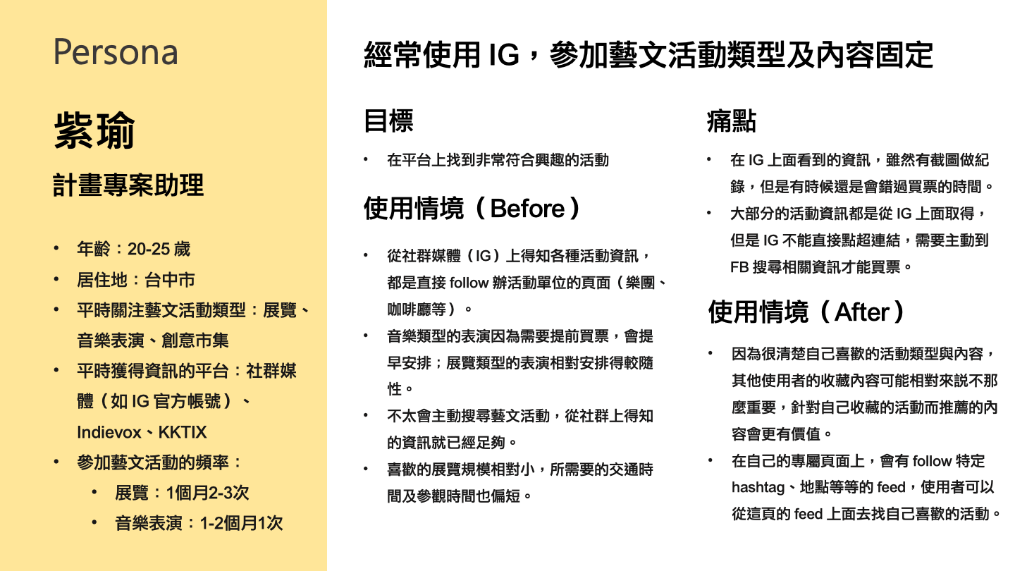 根據三種不同使用者,我們發現最大的共通痛點是「看到有興趣的藝文活動,不知道要收藏在哪裡」。因此我們團隊決定先從解決這個痛點為出發點,開始進行專案。