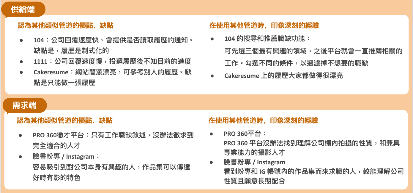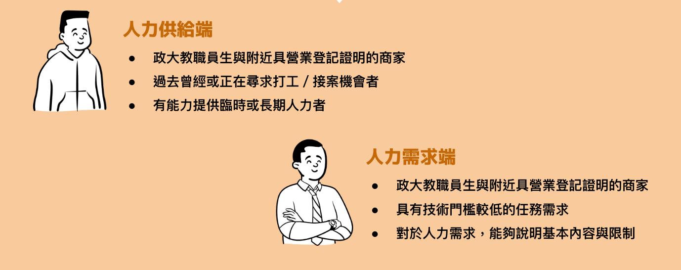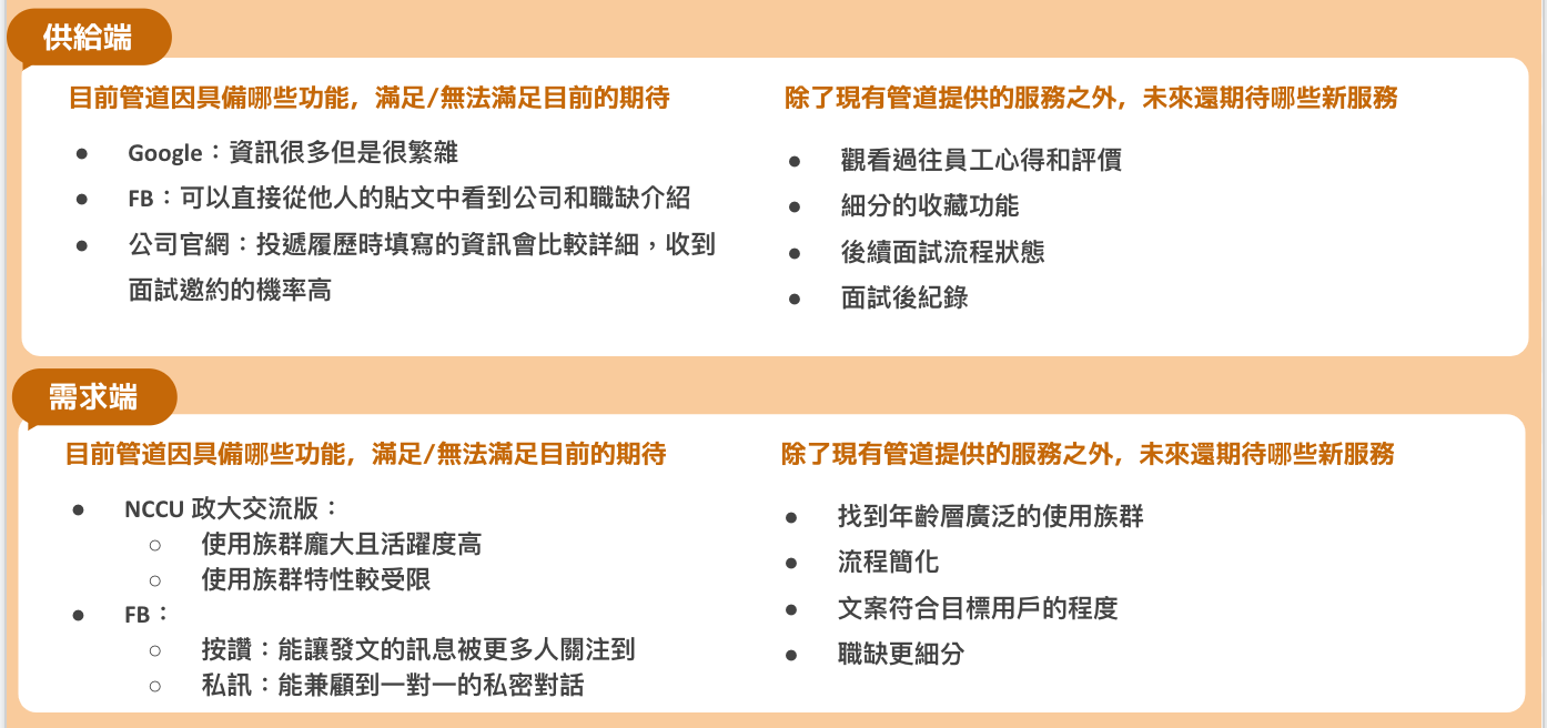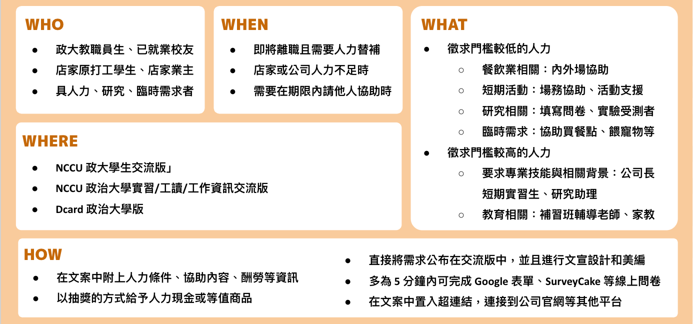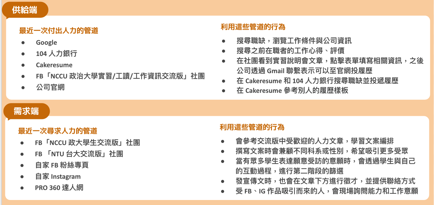 在設計⼀個能夠讓政⼤師⽣有效找到適合⼈⼒,或是找到賺錢(經驗)機會的平台之前,首先我們想透過觀察法,了解 TA 平常是透過哪些方法和資訊來尋求或提供人力。我們發現多數人採用的管道為社群媒體,其次為實體傳單與詢問親友。