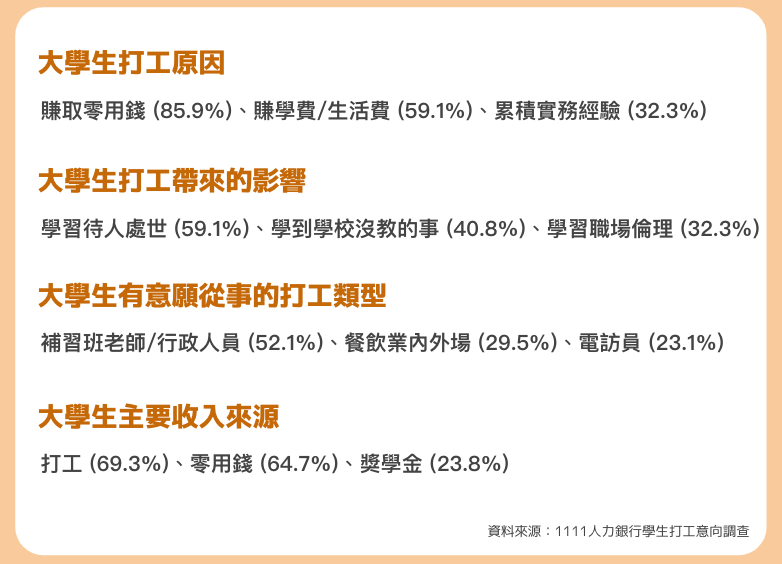 除了觀察法直接了解到政大師生的需求外,我們也透過桌面研究及二手資料的調查來宏觀地了解目前大學生打工景況。
